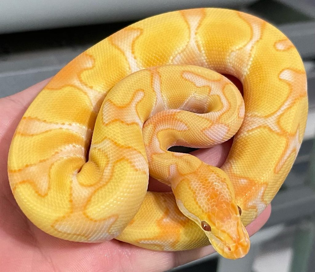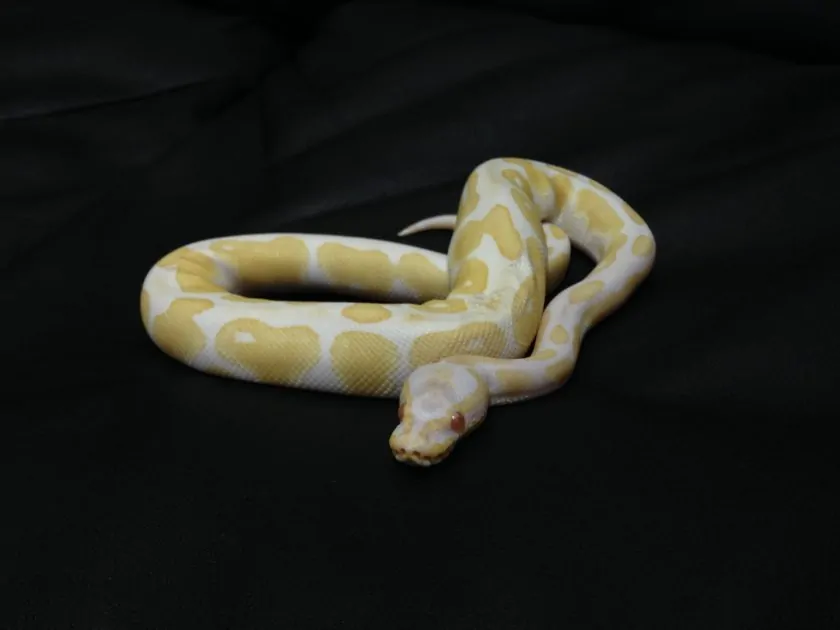 One of the first morphs to be established, the β€œalbino” ball python (which is better described as being amelanistic) remains one of the most eye-catching morphs available. Albino ball pythons are unable to produce melanin – the brown to black pigment which makes typical ball pythons dark looking. The result is a yellow and white serpent with bright red eyes.