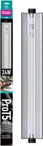 The fixture is designed for 2-foot-long tanks. It is 24-inch long and comes equipped with a 24-watt, 16mm diameter, 22.5-inch T5 High Output linear bulb (12% UVB and 30% UVA), a highly reflective removable reflector, a power cable, and montage hardware for easy installation. It also includes a free link cable that lets you daisy chain the fixture with up to nine other ProT5 or Jungle Dawn LED Bars.