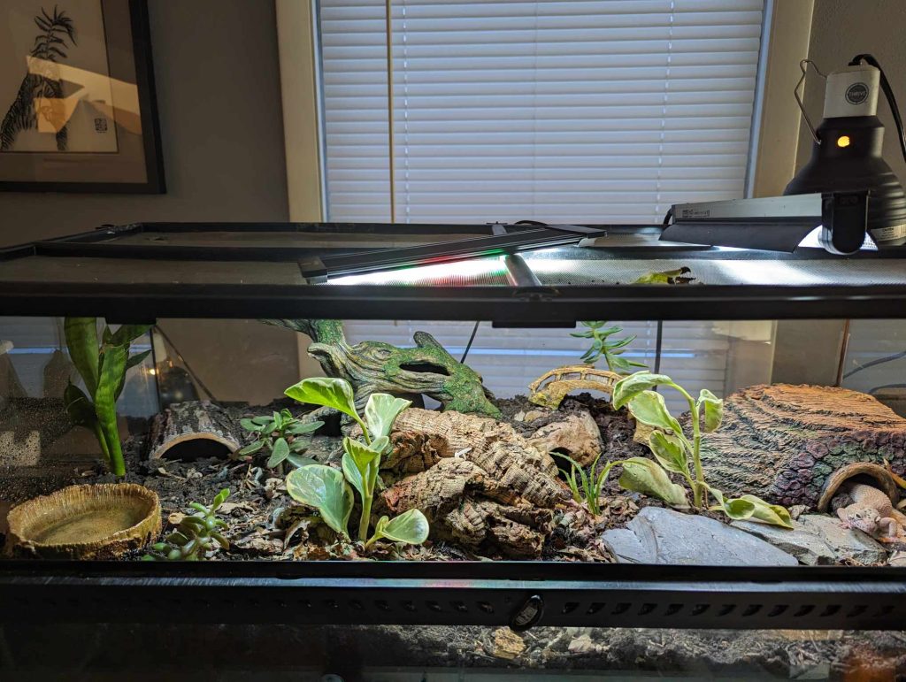 For his heating I’m are currently using a red heat lap but also going to add a heating pad for better heat and turn the light off at night.